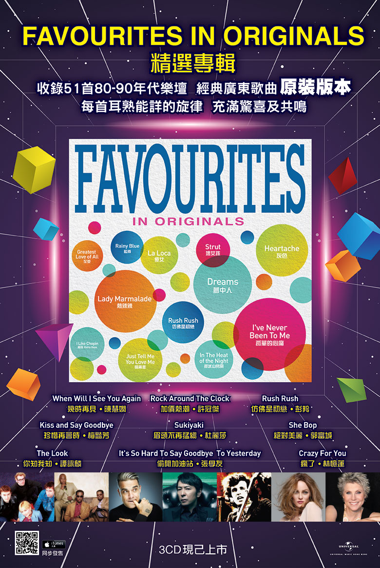 Favourites In Originals 2016年最新原唱歌曲精選,挑選51首80 – 90 年代本地流行樂壇當紅巨星經典廣東歌原裝版本,每首熟識的旋律,聽得很過癮!帶你回憶著譚詠麟,張國榮、四大天王及天后歌手等當年他們的最受歡迎代表歌曲。細味昔日美好時光! 感受他們的光輝歲月!