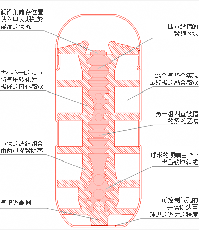世界最先进的性模拟器使用气垫原理,免去使用海绵或聚脂提供弹性。终极地,从未有过的黏合感因为杯内的 24 个自由移动的气仓而实现。