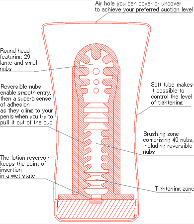 Now with a new soft tube, this cup gives you complete control over the tightening sensation. Feeling that suits you, controlled by how tightly or how lightly you grip the cup. Enjoy a wide variety of sensual sensations from rubbing, stroking, pressing, etc. One remarkable feature is the ability to "squeeze out" after ejaculation.