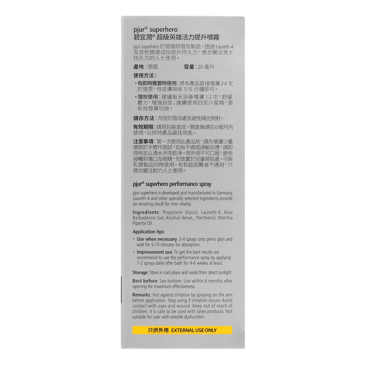 Ordinary long lasting products in the market use anesthetic like Benzocaine or Lidocaine as active ingredient. pjur®superhero performance spray for men however uses an ingredient Laureth-4 which is professionally made in Germany. This ingredient effectively reduce hyper-sensitivity yet differ from anesthetic, it would not accumulate in body so it is more safe.